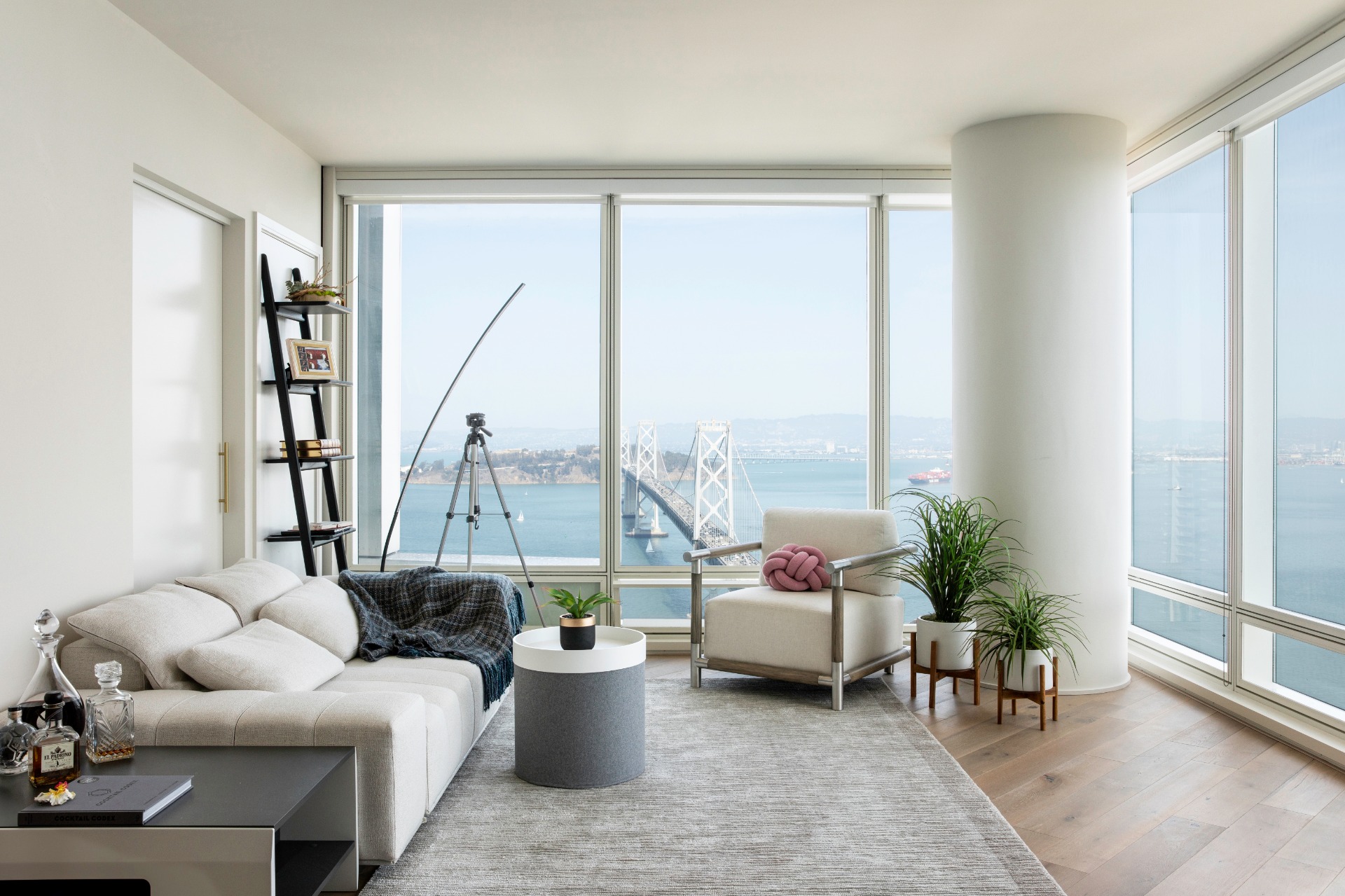 Modern and sleek furnishings for a condo. Light furniture upholstery adorned with modern shelfs and dashes of accent colors in a light filled living room.