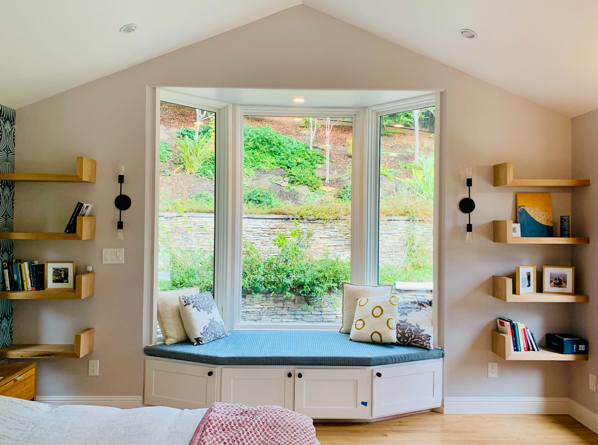 This bedroom has been extended and we added a new window and bench nook. We also added shelving to the sides for the extra storage. The space has become both beautiful and functional.