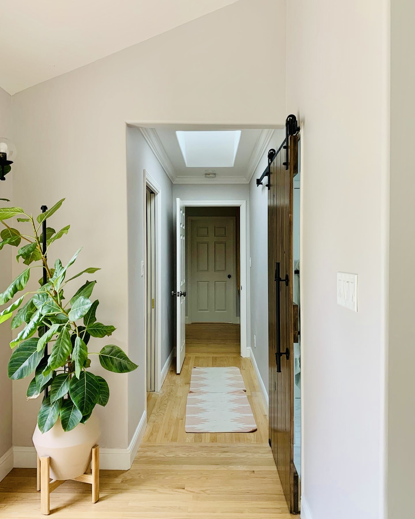 We love to design with natural elements such as planters and skylights. This long narrow hallway feels so welcoming after we added a large skylight and adourned with indoor planter.
