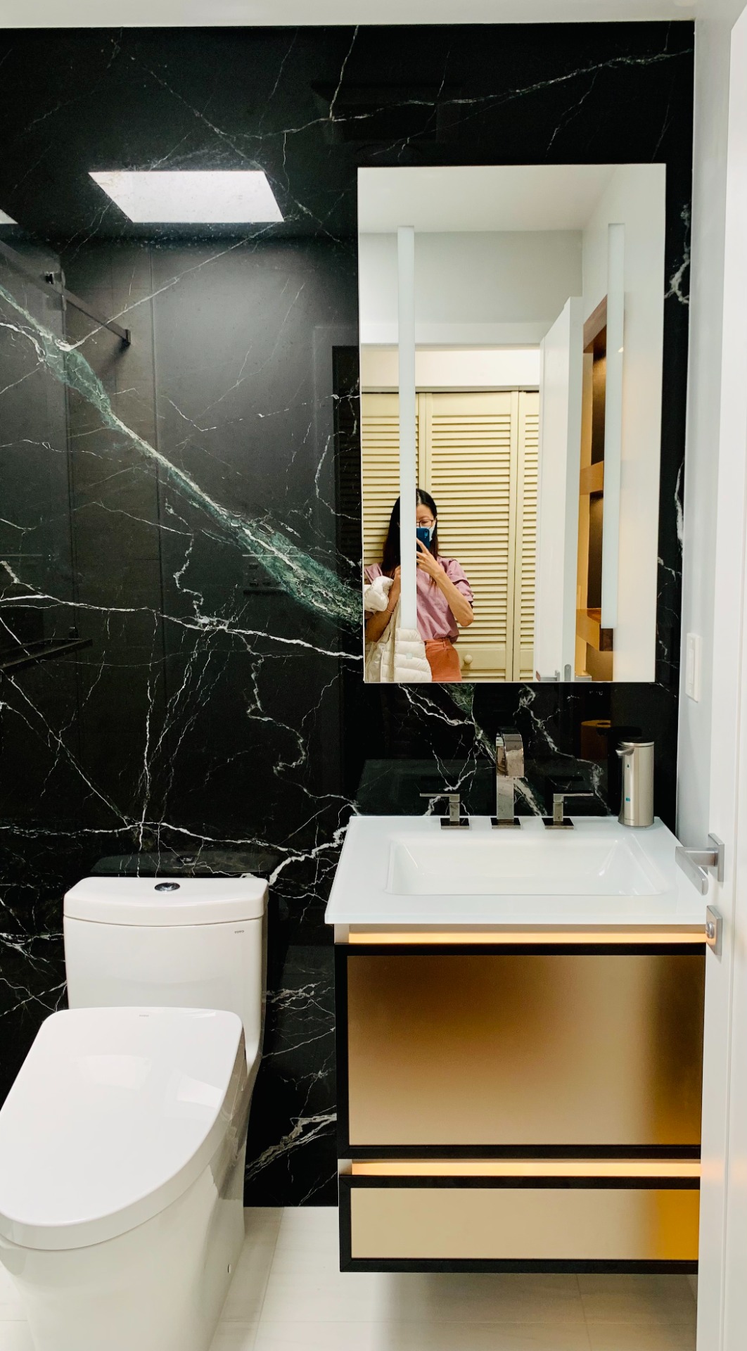 This bathroom is designed with full slab marble on the back wall and a contemporary bronze finish wall mounted vanity. The bronze and green veins of the marble complements well and it truly represents how to live in luxury.