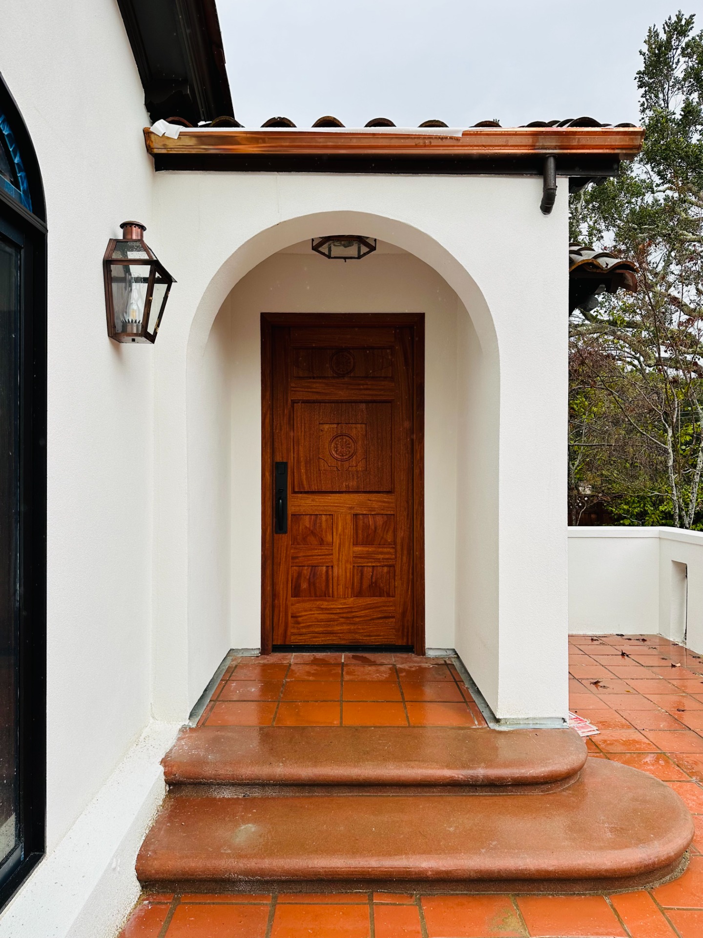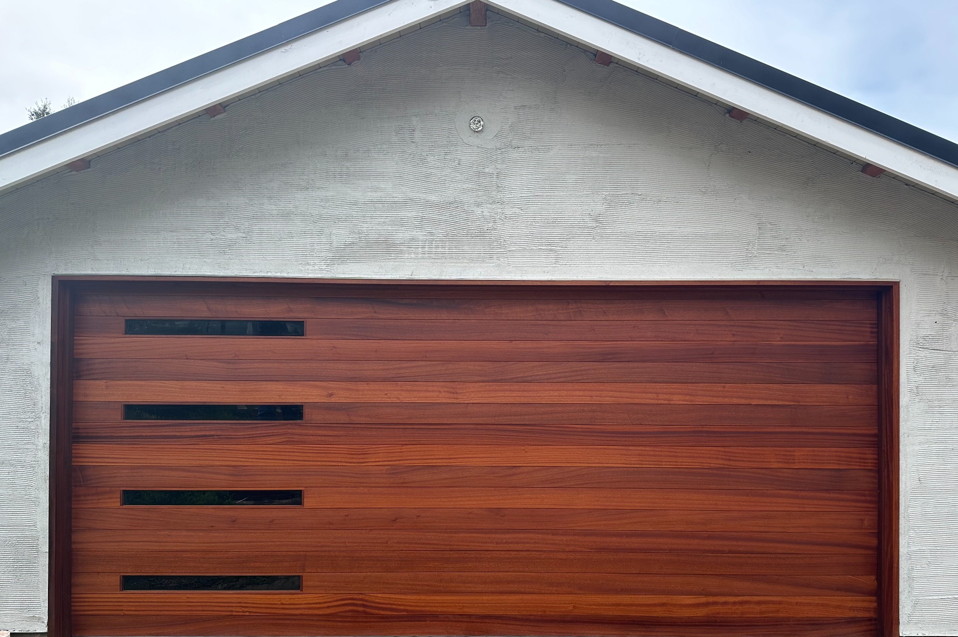 Garage door is one of the most important pieces for creating an impression on the house. This garage door is custom made with mahogany wood and black glass windows. The wood is then meticulously coated to perfection. This garage door has an impressive curb appeal for the house.