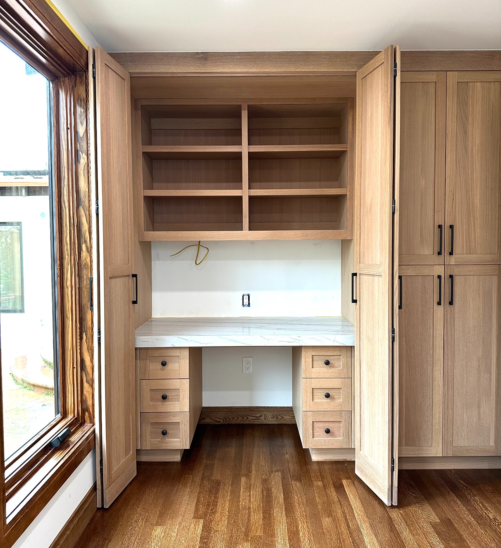 We created a craft/sewing and storage station for our client who loves arts and crafts. One can close this work station with the bifold doors and it will look the same as the closet next to it!